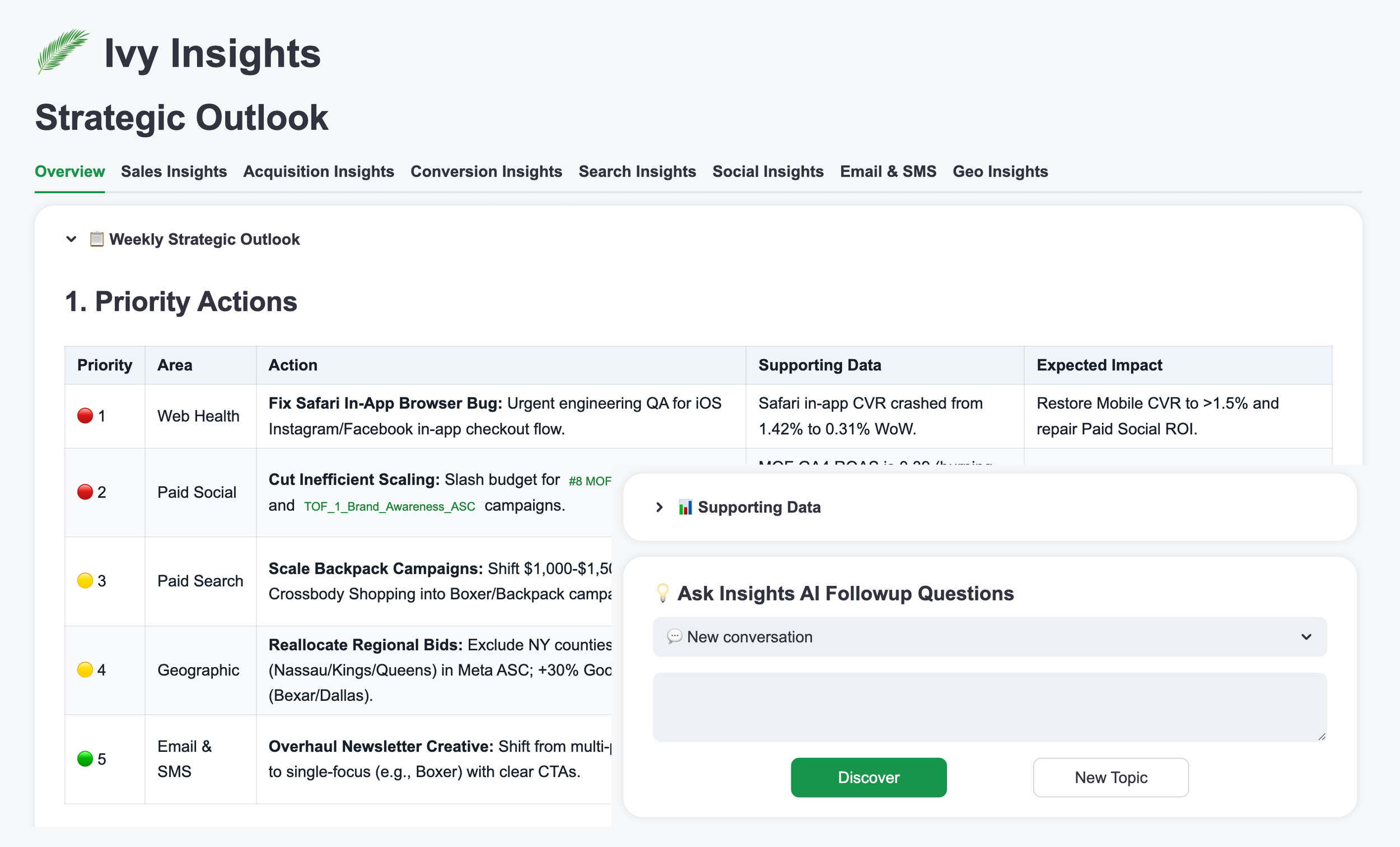 Ivy Insights connects the dots across your catalog, channels, and customer journey to deliver prioritized action plans for every growth lever.