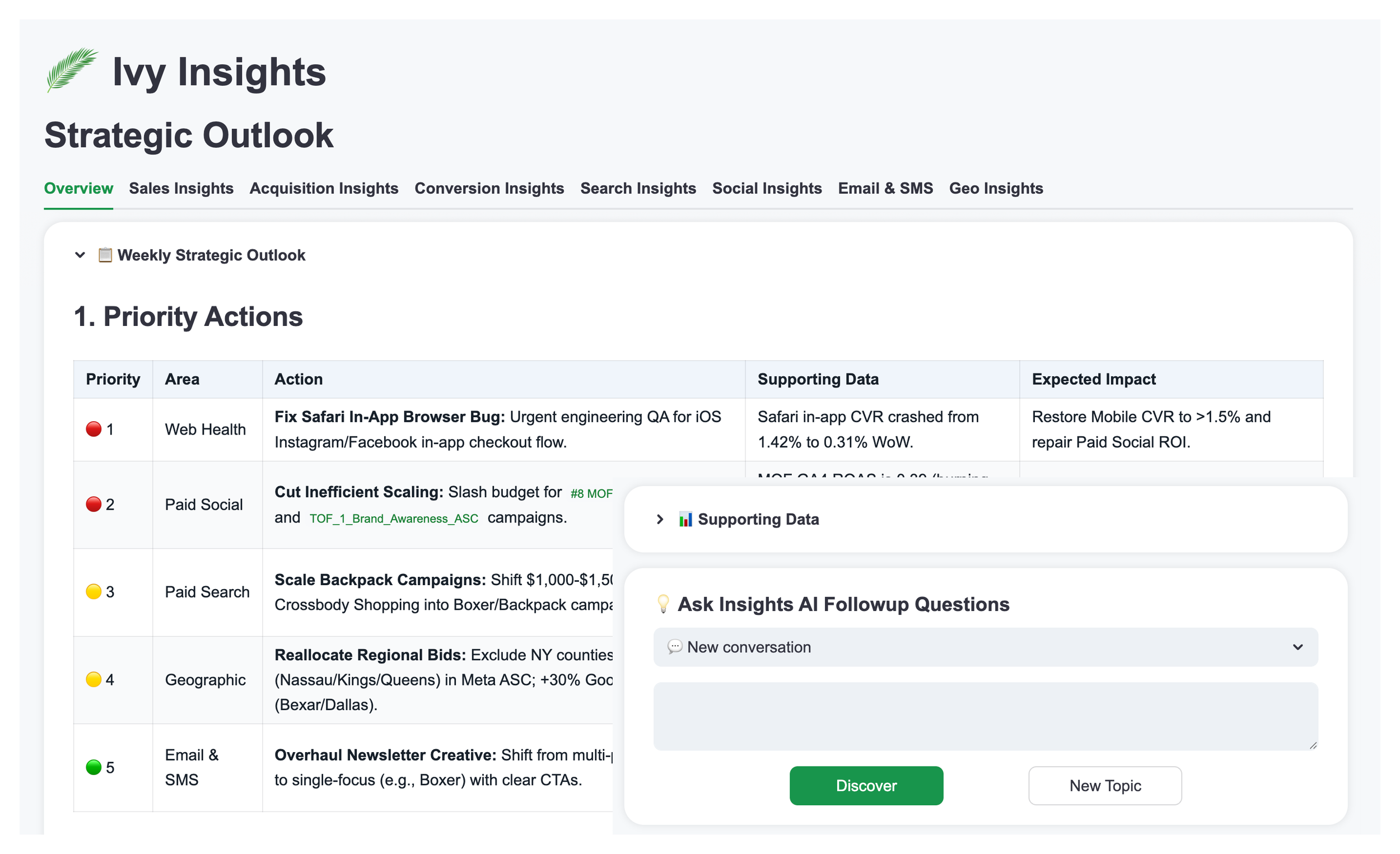 📋 Our Insights AI generates strategic reports, discovering what's happening, what to focus on, and the opportunities your team hasn't thought to look for.